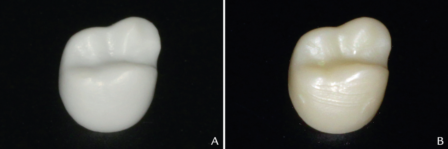 3D打印方法(左)與傳統(tǒng)CAM加工方式(右)制造的氧化鋯質(zhì)義齒對比圖